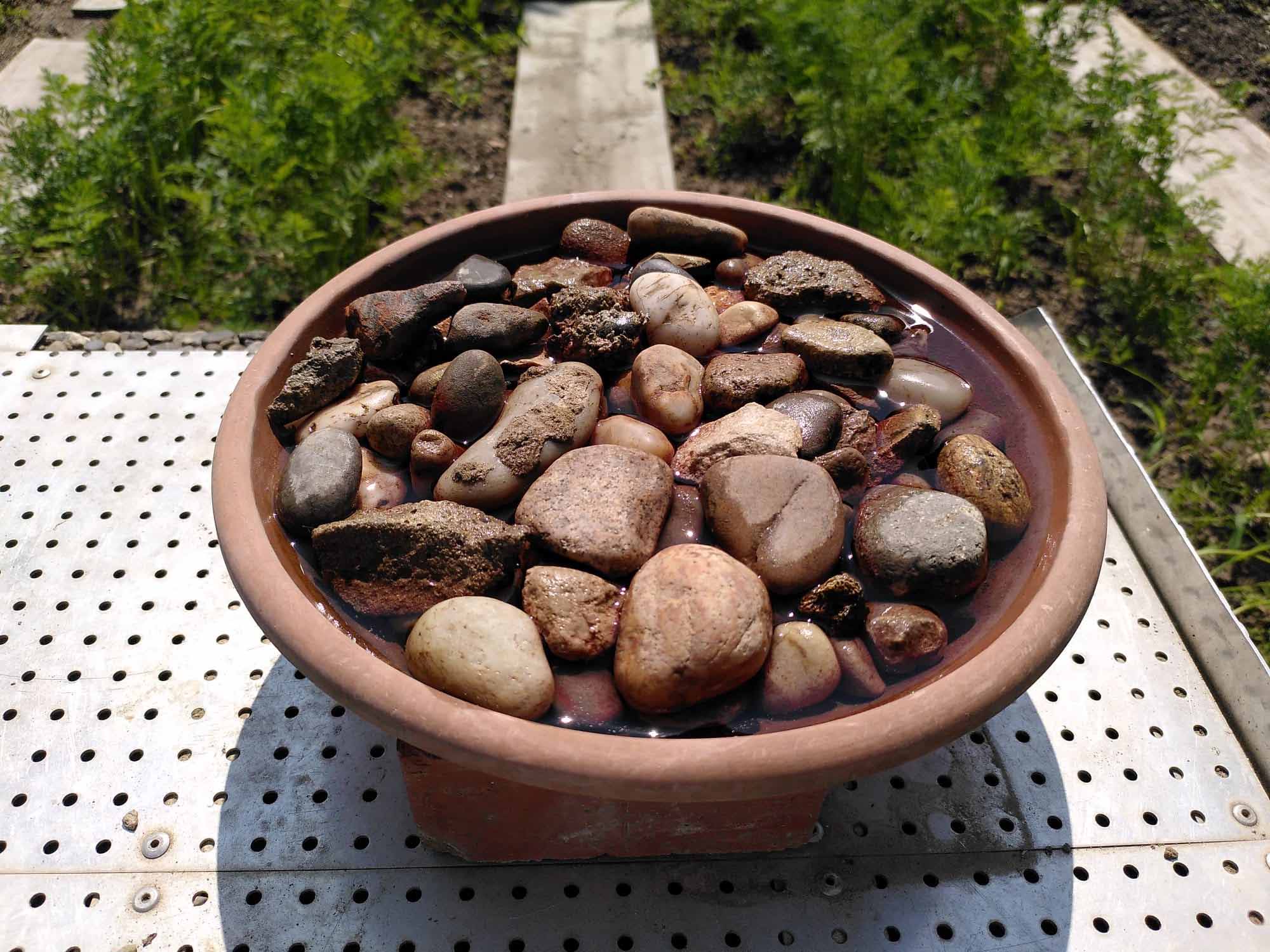 - Fülle ihn mit frischem Wasser – so, dass Steine über die Oberfläche ragen.