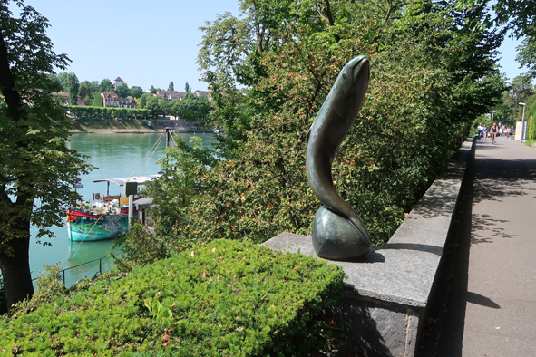 Die Bronze-Skulptur «springender Salm» (1940) des Basler Künstlers Willy Hege an der Solitude-Promenade gibt Hoffnung auf eine baldige Rückkehr des Wanderfisches. <br> Bildquelle: Amt für Umwelt und Energie