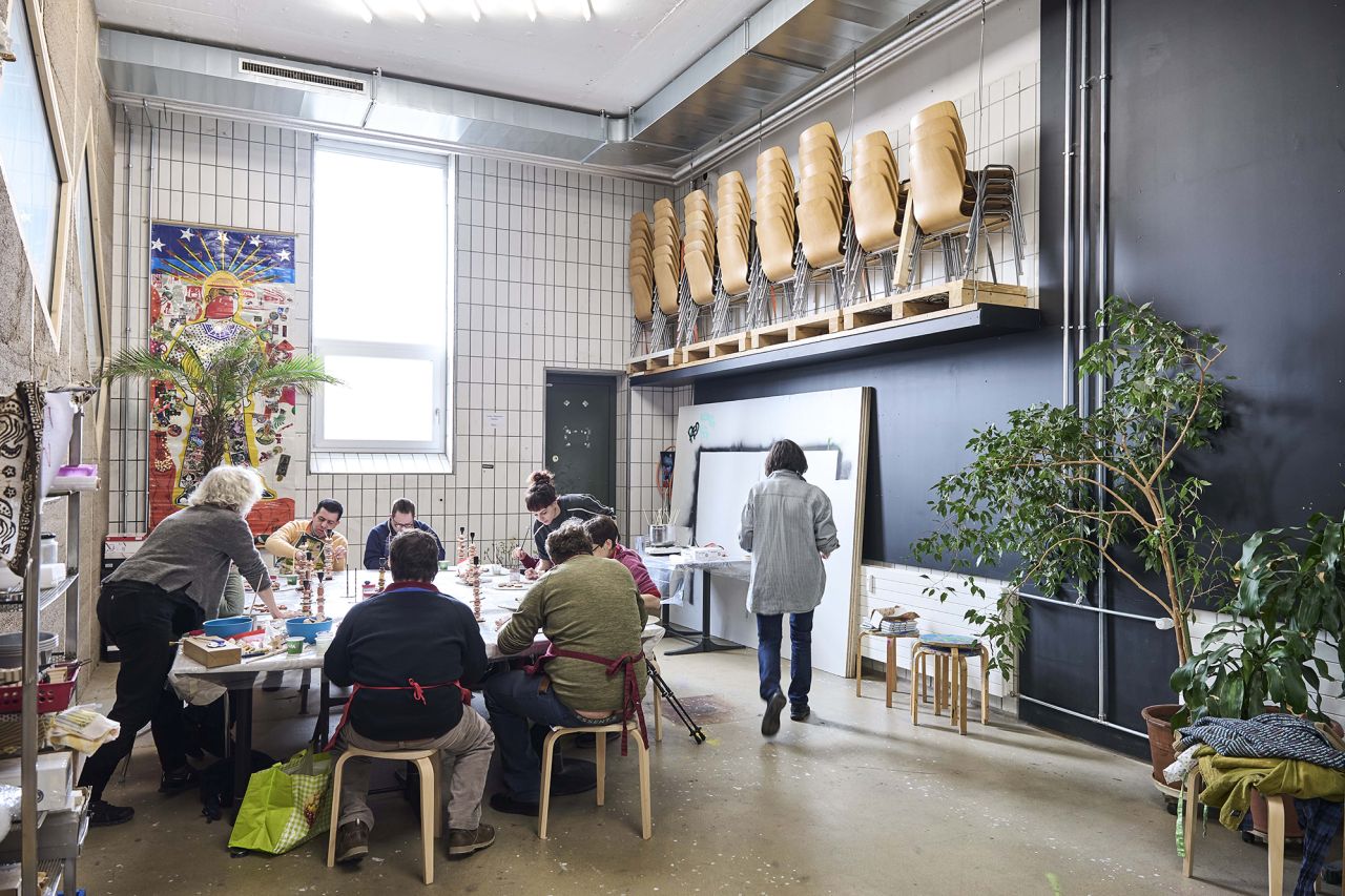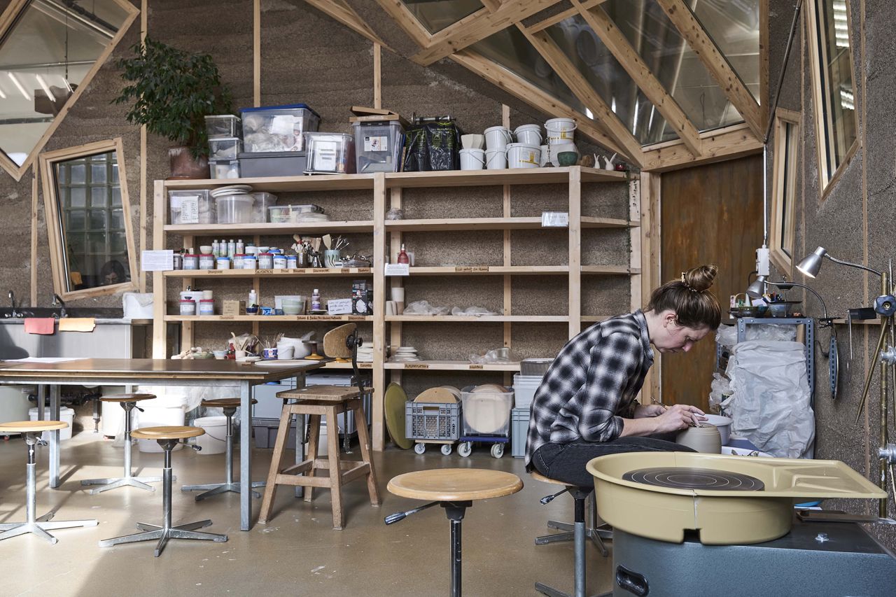 Passend zum Elys-Gebäude hat das Freiwerk-Team für die Gestaltung seiner Werkstätten ebenfalls überwiegend gebrauchte Bauteile eingesetzt. «Um die Nähwerkstatt räumlich abzutrennen, haben wir die alten Türen einer ehemaligen Fricktaler Fabrik und Fenster aus zweiter Hand verwendet.», erläutert Giannini. Die Wände der Töpferwerkstatt bestehen aus Hanfbeton, einem Abfallprodukt aus der Fasergewinnung, das mit Wasser und Kalk vermischt wird. In diese wurden Fenster aus Restbeständen eingesetzt. So entstanden transparente Werkstätten, was die Kommunikation fördert. Die Maschinen des Freiwerks stammen meist aus Räumungen von Handwerksbetrieben: Die Geräte der Fotowerkstatt etwa gehörten ursprünglich der Basler Gerichtsmedizin. Die Fräsmaschine in der Metallwerkstatt ist die Leihgabe eines pensionierten Velobauers. Und die orangefarbenen Spinde, in denen die Besucherinnen und Besucher ihre Wertsachen einschliessen können, waren Eigentum der Post.