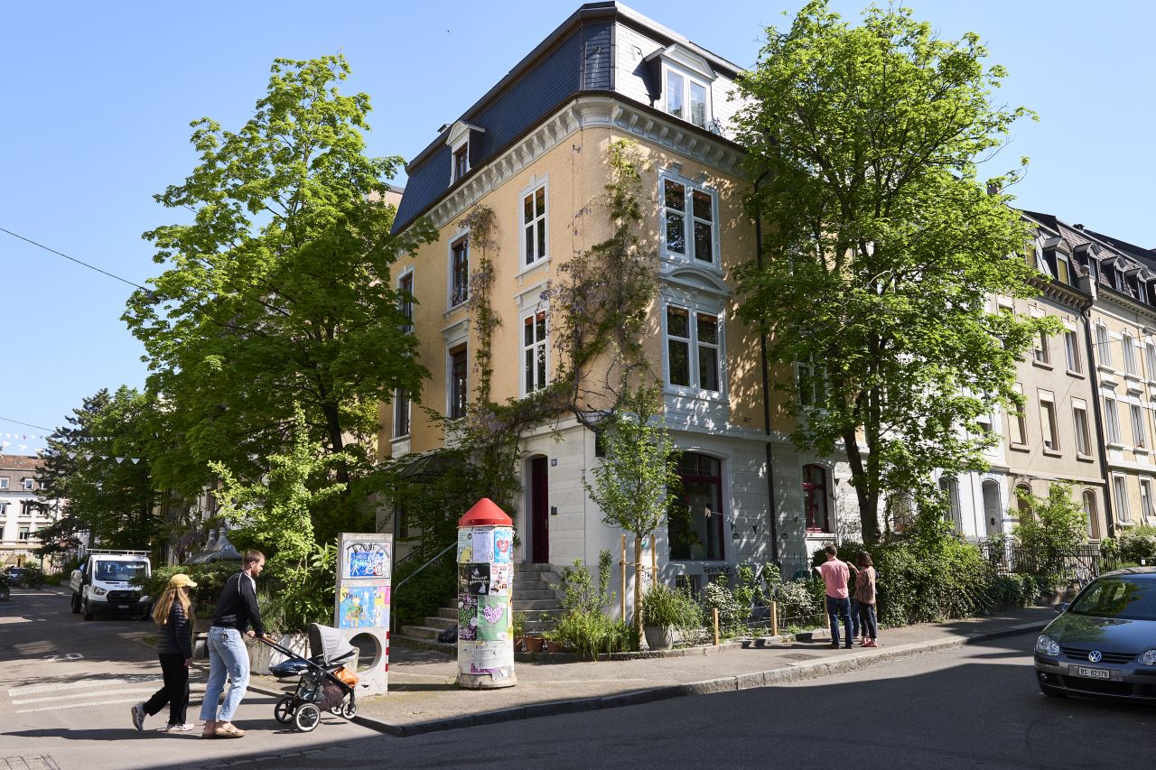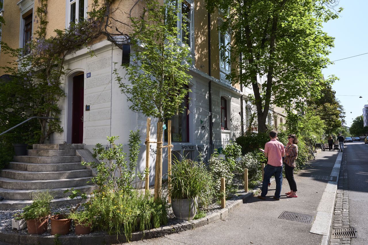 Der Schlüssel zur sommerlichen Kühlung lag buchstäblich vor der Haustür: ein betonierter Vorgarten von 26 Quadratmetern. Während andere Abschnitte in der ersten Spielstrasse der Schweiz mit üppigen Pflanztrögen und Rabatten reich begrünt sind und Hasel, ein Busch Pfingstrosen und Glyzinie am Eingang des früheren Lebensmittelgeschäfts um Platz rangeln, bildete diese Ecke eine graue Öde. «Wir Bewohnerinnen und Bewohner hielten uns deshalb in der Vergangenheit dort kaum auf. Die Fläche wurde immer wieder als wilde Deponie genutzt», erzählt Sarine Waltenspül. Die Historikerin ist im Quartier aufgewachsen und arbeitet ehrenamtlich im Vorstand der Wohngenossenschaft Cohabitat mit, zu der die Liegenschaft gehört.