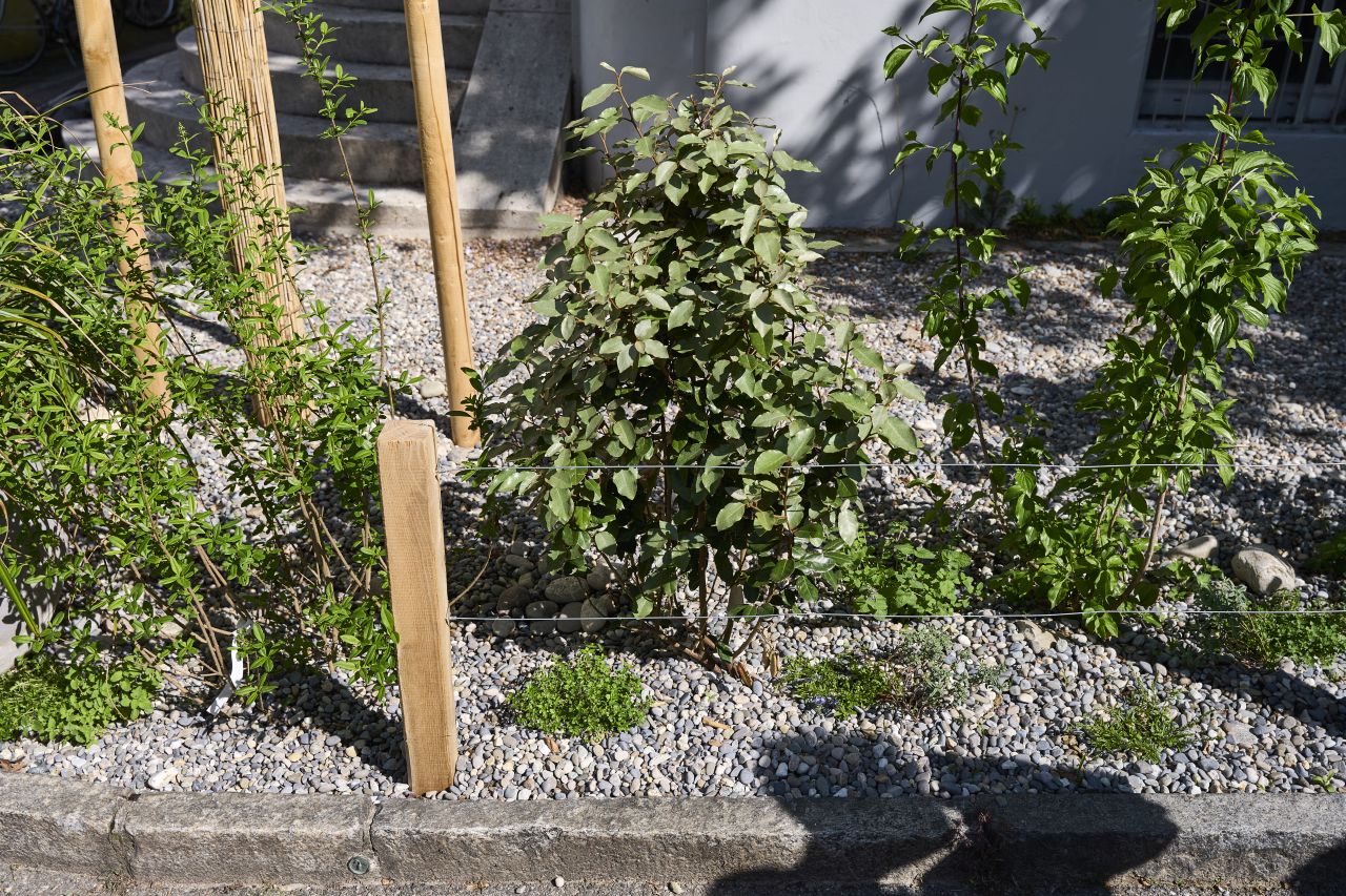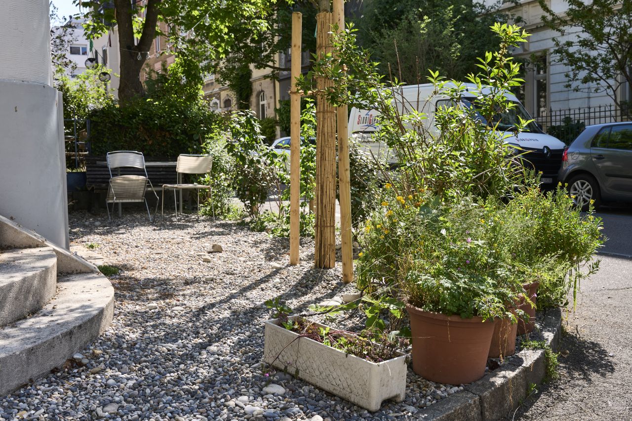 Im Fall der Cohabitat-Liegenschaft klärte ein auf Naturgärten spezialisierter Gartenbaubetrieb ab, welche Bepflanzung sich für diese exponierte Südseite eignet, und schlug vor, hinter der neuen Hecke einen Sitzplatz mit Rheinkies zu gestalten. Nun stehen acht Liguster, Hartriegel und Gemeiner Schneeball in prallem Grün und dürften sich schon in wenigen Monaten zu einem Sichtschutz zwischen Trottoir und Sitzbank verweben. Im Wurzelbereich wuchern Kräuter wie Ehrenpreis, Sonnenröschen und Thymian. Daneben stehen ein paar wild bepflanzte Balkonkistchen und grosse Terrakottatöpfe, etwa eine Forsythie. Ein schon meterhoher Feigenbaum wurde eingepflanzt, auch er gehörte nicht zum ursprünglichen Pflanzkonzept. «Ich haben diese von meinem Balkon heruntergebracht, die Pflanzen gedeihen hier deutlich besser», so die Bewohnerin.